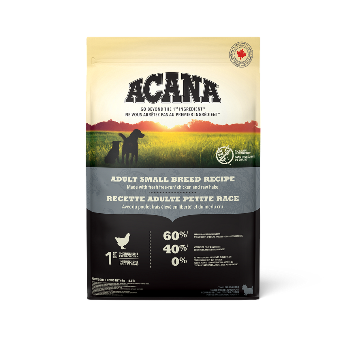 Composición: Pollo fresco (16%), pollo deshidratado (15%), lentejas rojas enteras, guisantes verdes enteros, garbanzos enteros, pavo deshidratado (4,5%), grasa de pollo (4%), menudillos de pollo frescos (hígado, corazón) (4%), arenque deshidratado (4%), huevos (4%), platija cruda (4%), aceite de pescado (4%), lentejas verdes enteras, guisantes amarillos enteros, fibra de guisante, almidón de guisante, hígados de pavo crudos (0,5%), sal, alga kelp deshidratada, calabaza entera fresca, calabaza moscada fresca, zanahorias enteras frescas, manzanas enteras frescas, peras enteras frescas, calabacines enteros frescos, raíz de achicoria deshidratada, col rizada fresca, espinacas frescas, grelos frescos, hojas de nabo frescas, arándanos rojos enteros frescos, arándanos azules enteros frescos, bayas de saskatoon enteras frescas, cúrcuma, cardo lechoso, raíz de bardana, lavanda, raíz de malvavisco, escaramujos.