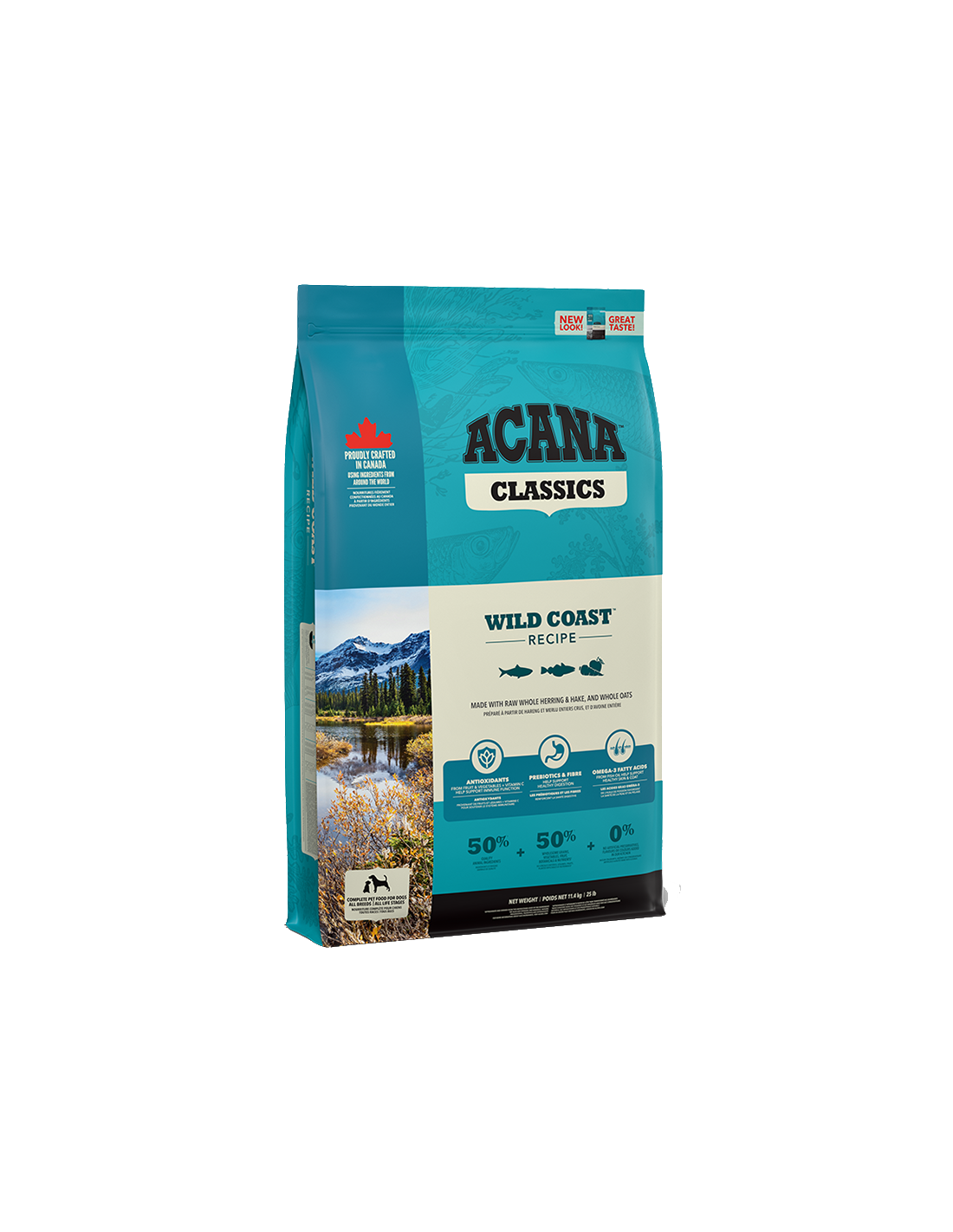 Composición: Salmón crudo (22 %), arenque deshidratado (19 %), cebada perlada, guisantes enteros, granos de avena, grasa de cerdo (8 %), avena integral, fibra de garbanzos, aceite de pescado (1 %), carbonato de calcio, cloruro de potasio, alga kelp deshidratada, sal, raíz de achicoria seca, calabaza entera fresca, calabaza butternut entera fresca, zanahorias enteras frescas, manzanas enteras frescas, peras enteras frescas, calabacín entero fresco, col rizada fresca, espinacas frescas, grelos frescos, hojas de remolacha frescas, arándanos rojos enteros, arándanos azules enteros, bayas de Saskatoon enteras, cúrcuma, cardo lechoso, raíz de bardana, lavanda, raíz de malvavisco, escaramujos.