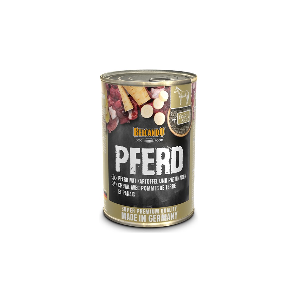 Carne, corazón, mollejas de caballo, hígado y pulmón de caballo (63%); caliente de carne (28,5%); patatas (4%); chirivías (2%); semillas de chía (1%); aceite de cardo (0,5%); cáscaras de huevo secas (0,5%); minerales (0,5%)