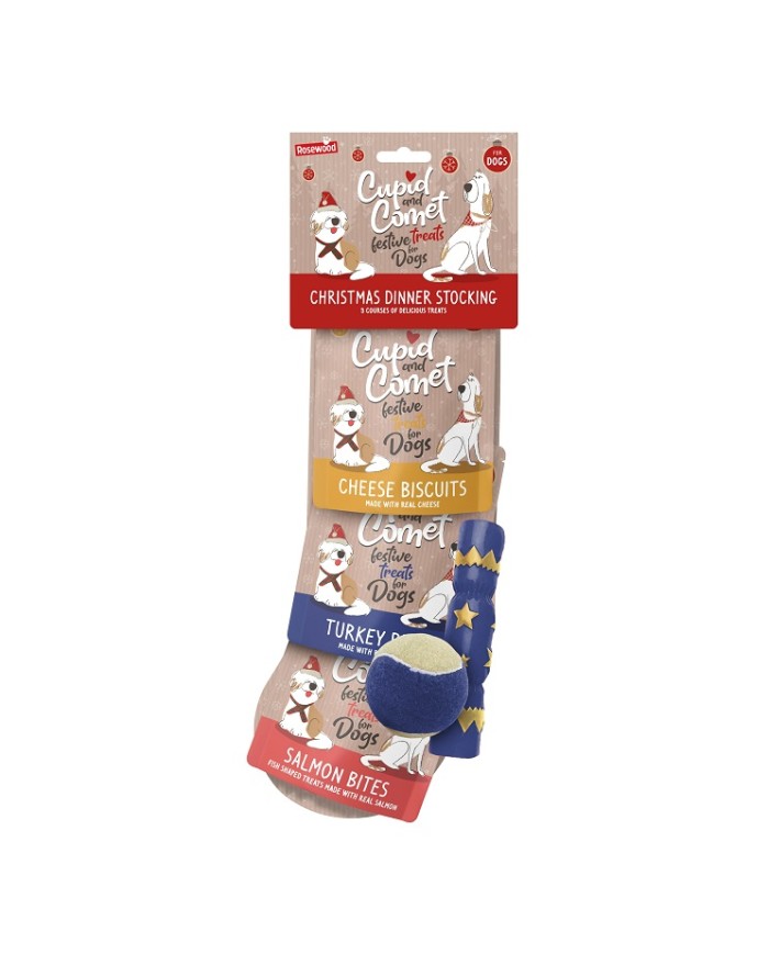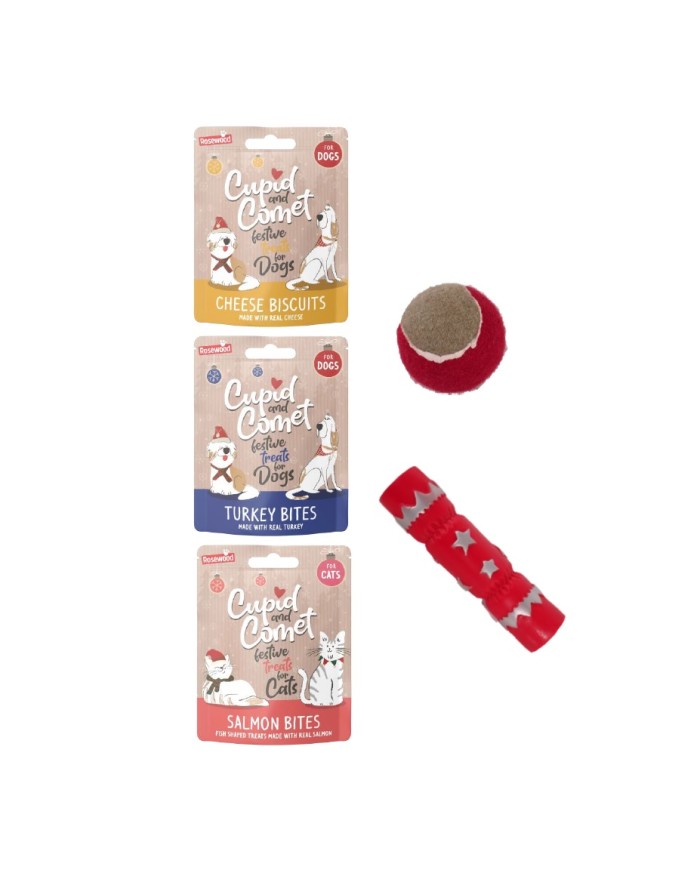 Entrante: salmón – Plato principal: pavo – Postre: galletas de queso y 2 juguetes: pelota y mordedor.