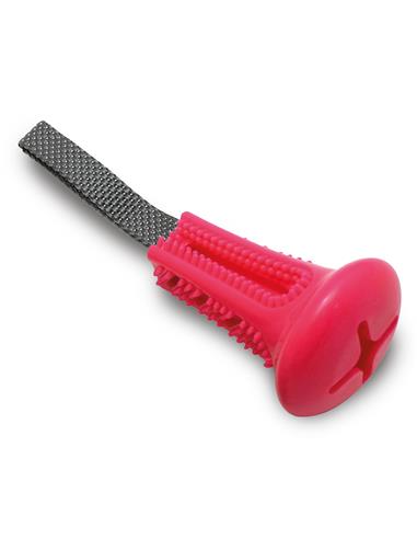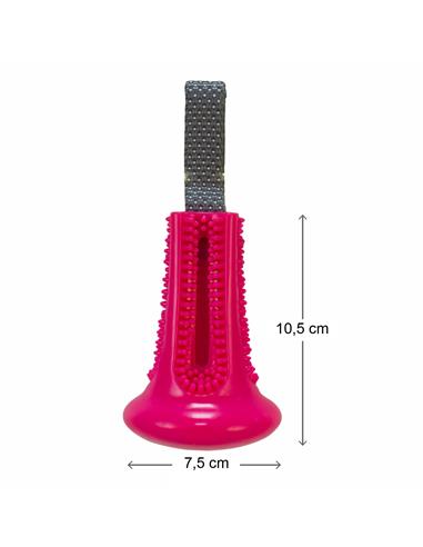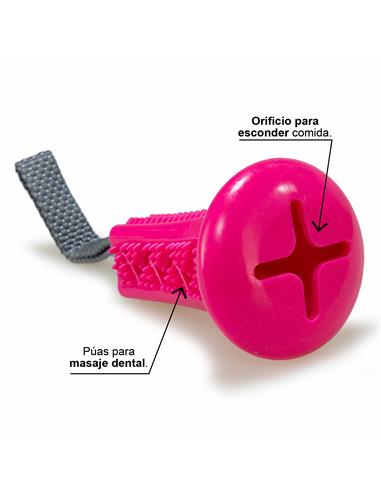 Juguete para perros. Se puede utilizar para lanzar y recoger, para jugar a que el perro tire de él o para que sea utilizado para masaje dental, posee unas púas blandas ideales para esto. También tiene un orificio donde colocar snacks o pequeñas porciones de alimento. Con una asa de polyester.