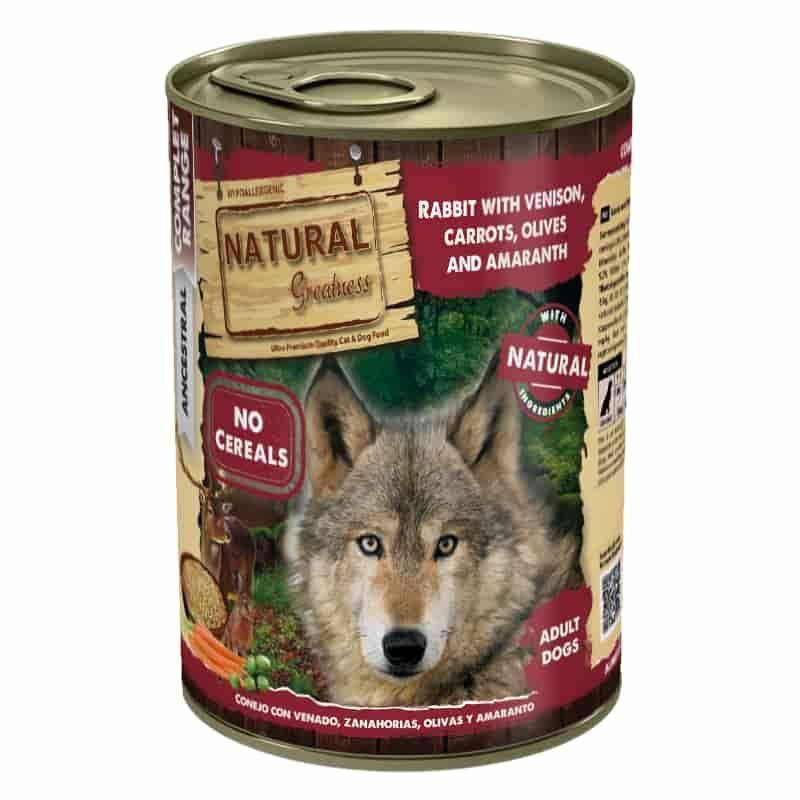 Carne de Conejo (35%), carne de Pollo (26%), carne Ciervo (4%), Caldo, Zanahoria (3%), Aceitunas (2%), Semillas de amaranto (1%), Sustancias minerales.
