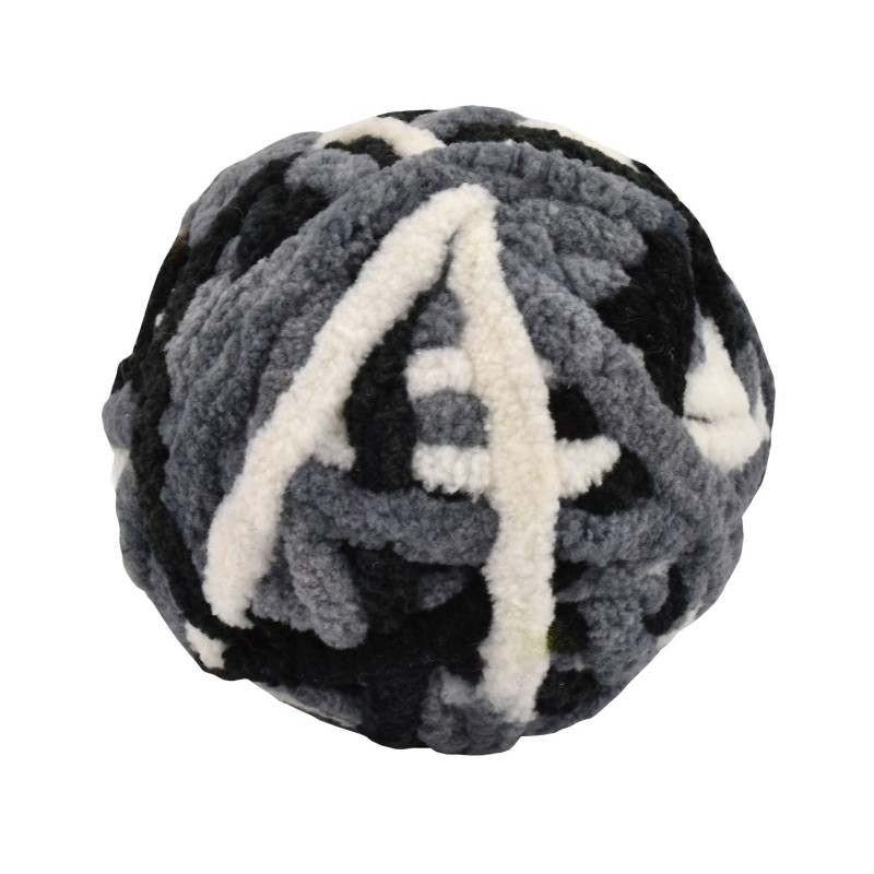 Pelota de lana con tonos grises y blanco, con sonido al moverse.