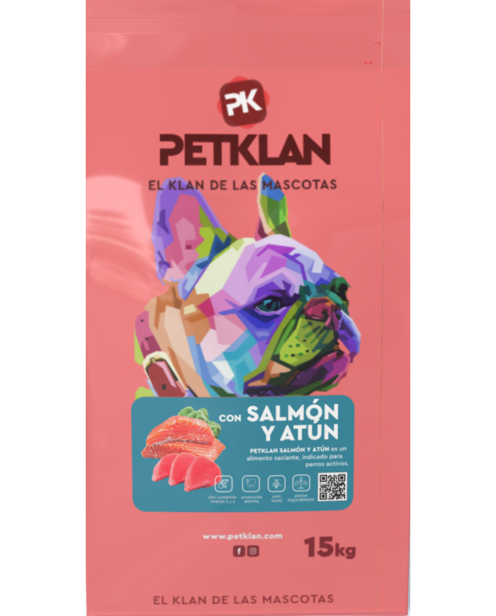 Salmón 25% (salmón fresco (10%) y salmón deshidratado (15%)), arroz integral 17%, atún deshidratado 14%, manteca de cerdo ibérico 13%, copos de patata deshidratada 10%, cebada integral 7%, pulpa de remolacha 3%, aceite de salmón 3%, hígado de pollo, huevo deshidratado, espinacas deshidratadas, miel en polvo, manzanilla, alga espirulina, comino, boldo, cúrcuma, productos de levadura, manzana verde deshidratada, cáscara de almendra, aceites esenciales de orégano, canela, clavo, tomillo y té verde, condroitina sulfato, colágeno y glucosamina, MOS y FOS y conservantes naturales.