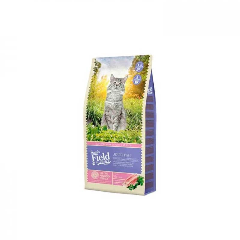 Sam’s Field Cat Fish es un alimento completo para gatos exigentes. Con 25% de pescado blanco, 18% de salmón, frutas y vegetales.