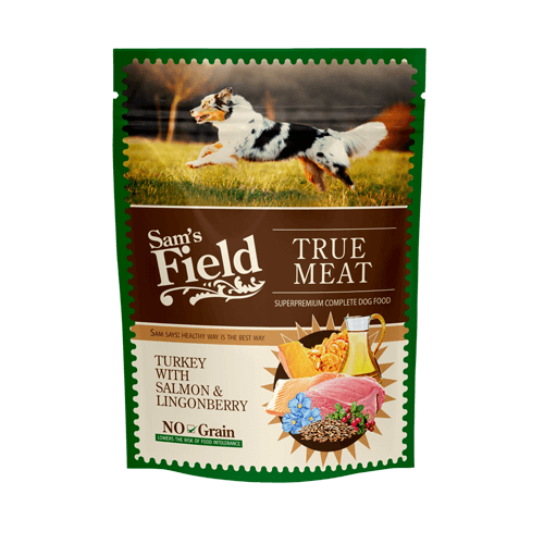 45% carnes de pavo, 10% carne de salmón, 2% arándano, 1% harina de guisante, 1% lignocelulosa, 1% aceite de semillas de lino.