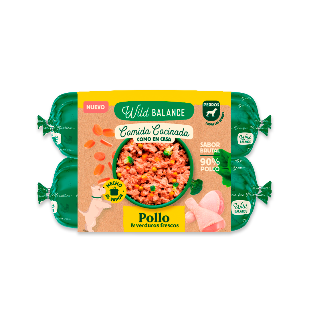 90% Pollo (47% carcasa de pollo, 28% pechuga de pollo, 10% hígado de pollo, 5% corazón de pollo), 5% Zanahoria, 3% Guisantes, 1% Brócoli, 1% Calabaza. Contiene huesos triturados para una alimentación completa.